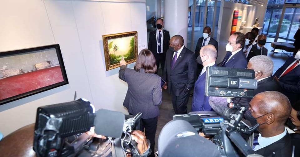South African President, Cyril Ramaphosa, interacting with “Paloceae Lupantozoa” during a visit to the Sasol Corporate Art Gallery in Sandton, Johannesburg. (Image courtesy of Sasol Art Gallery 2022)